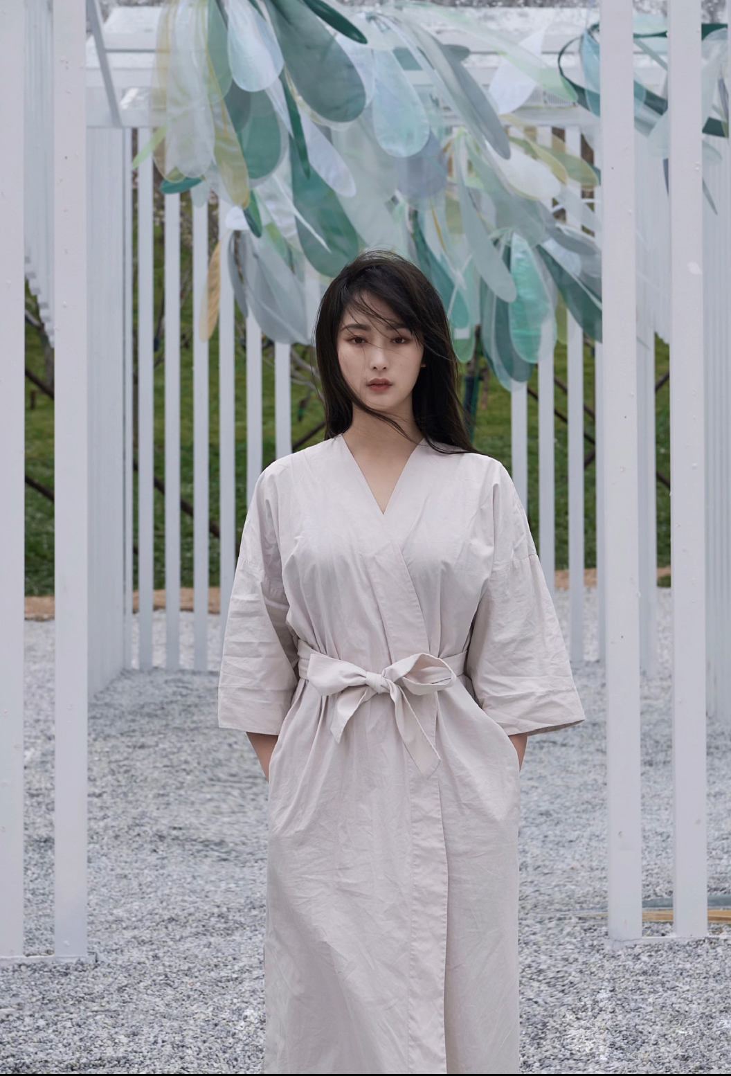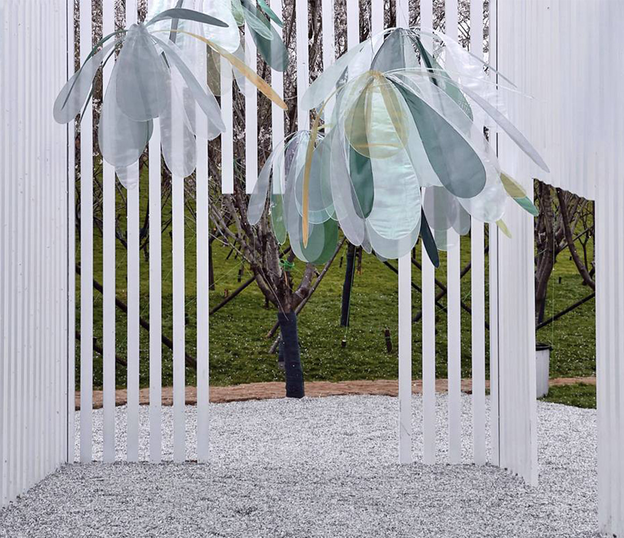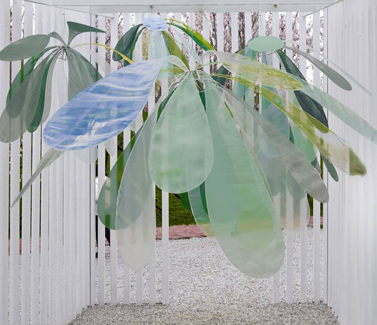 该装置为在静止的状态下远远看去,就像一朵朵巨大花蕊倒立生长,当人走进装置建筑内时,通过红外线感应系统识别,装置整体开始模拟蜻蜓有规律的向上运动,感应里程为5-8M。