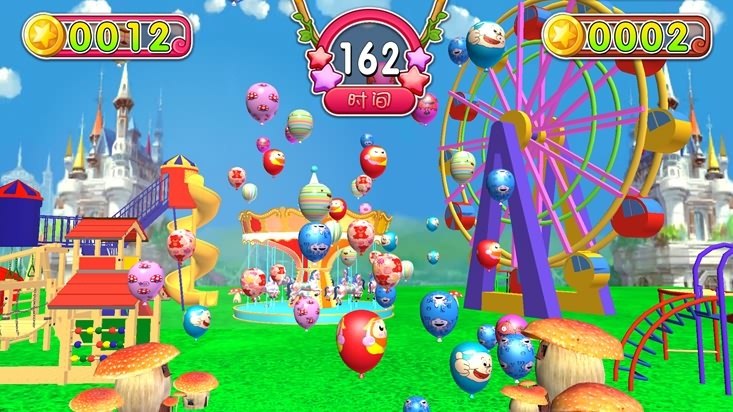 内含多个游戏。 两个玩家同时进行比赛。互动方式是拿小球砸向相应游戏场景的物体产生特效并获得金币,倒计时结束获得金币数量多的一方胜利。