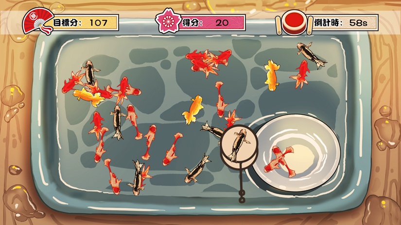 画面中击打中的金鱼会被捕捞并获得分数,倒计时结束获得的总分数超过目标分数可以通关。