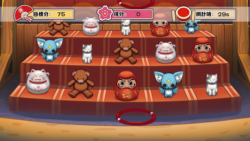 游戏设有关卡,通关时间为一分钟,点击出来的圈圈套中公仔会有分数增加,倒计时结束获得的总分数超过目标分数可以通关。