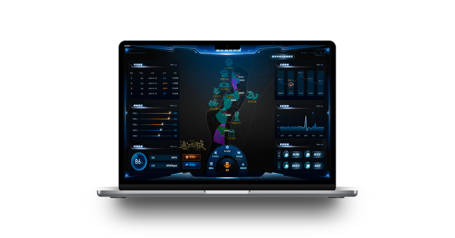 全场景智慧总控系统——一体化景区智能化管理平台,实现景区内各项设施的智能化控制、景区各区域数据可视化处理